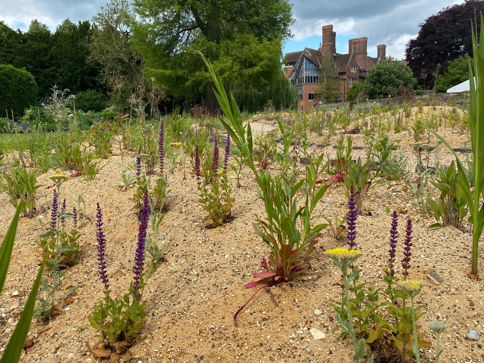 We recycled and crushed leftover building materials to use as our planting medium, including some original bricks which couldn’t be reused in the new build. Planted within this medium are hardy perennials that will stay in all year round, creating not just structure in the beds but habitat for all manner of creatures. There are also annuals that will be allowed to self-set, forever continuing their lifecycle. The mounds of sand and gravel you see also give extra habitat to increase the biodiversity in the area. Once established, this riverbed will not need watering or fertiliser, and will require less input from the gardening team and the environment.
