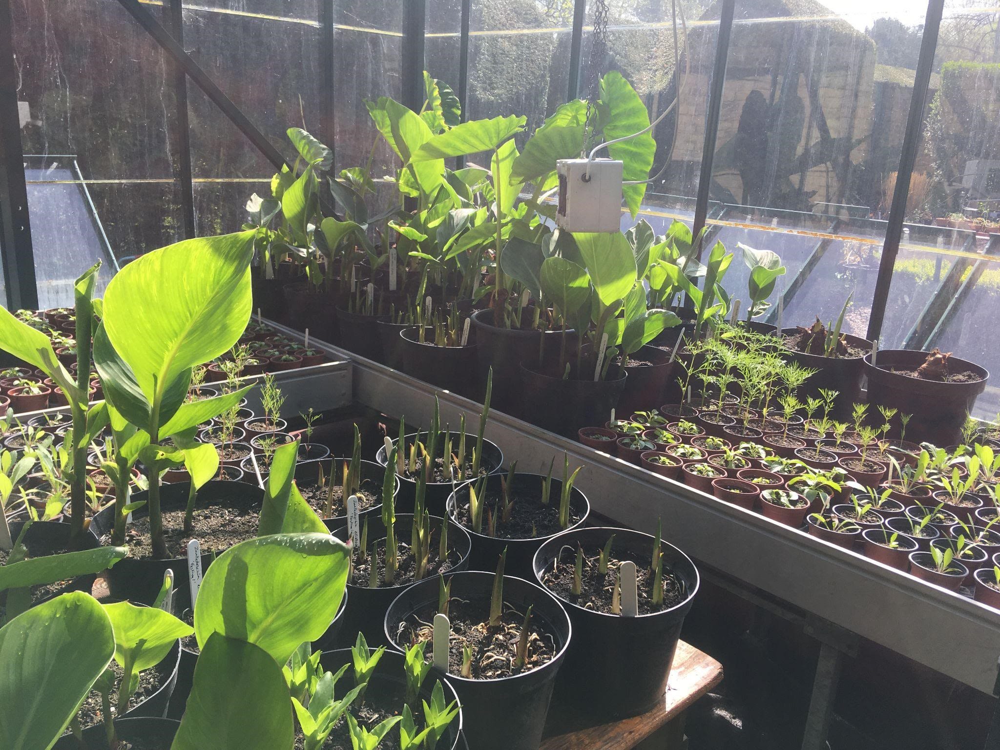 Since this garden is a natural frost pocket, all tender perennials are lifted each year before the winter frosts and stored in the greenhouse. Depending on the time of year, you might see bananas left in situ protected with straw and horticultural fleece. The whole garden is then planted out again in May. In an effort to move towards more sustainable planting, those tropical plants that do not survive hard frosts are not replaced but instead substituted with hardier, more suitable plants for this chilly part of the garden.