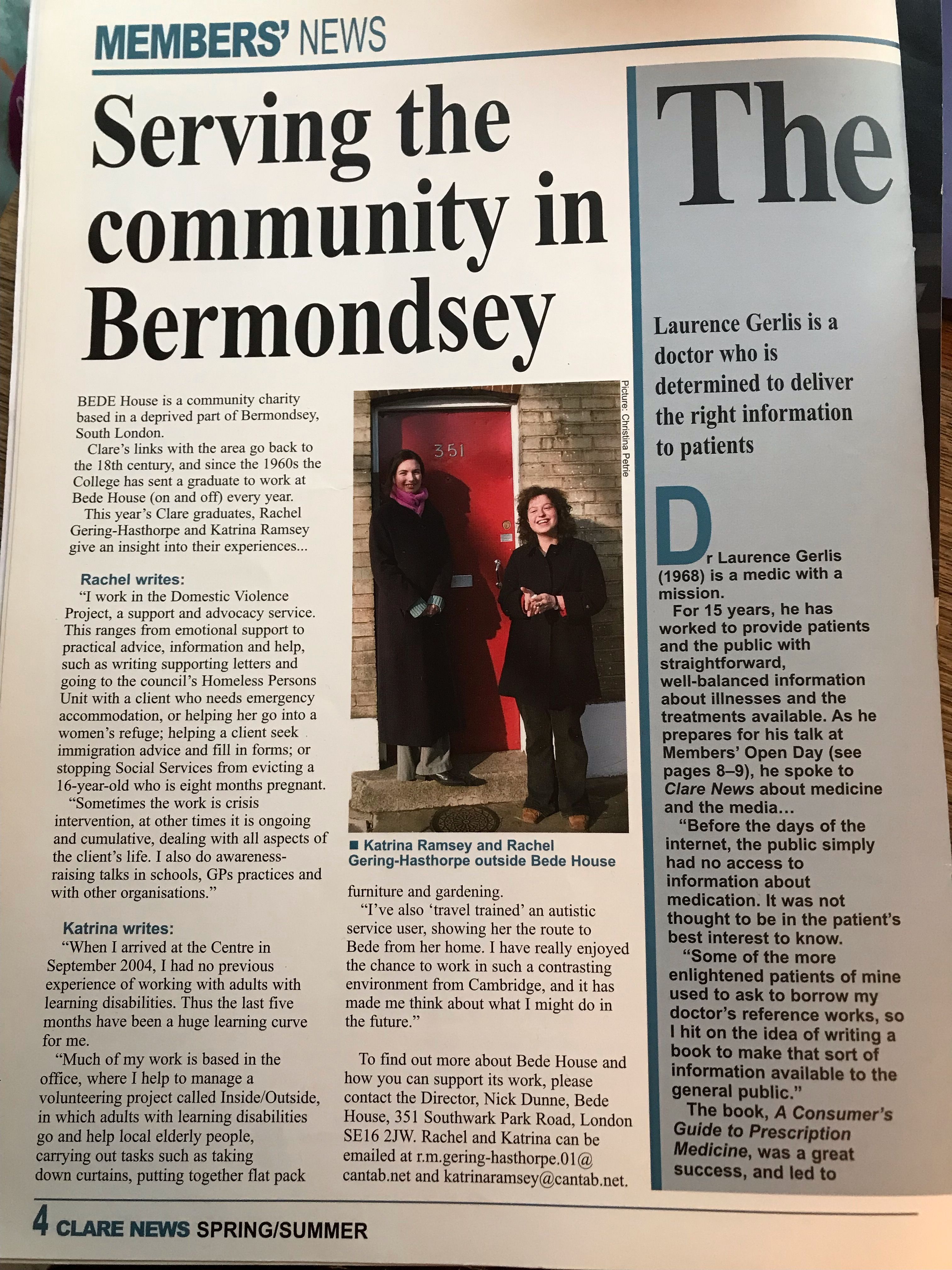 Founded in 1938, Bede House is a Southwark charity whose aim is to help and support those who are affected by poverty, learning disability and domestic violence. For more than 20 years, the Clare and Bermondsey Trust has funded an annual graduate placement on one of Bede’s projects. Earlier this year, Rev’d Mark Smith visited Bede House to see the impact of its work and to discuss the ongoing relationship between Bede House and the College.