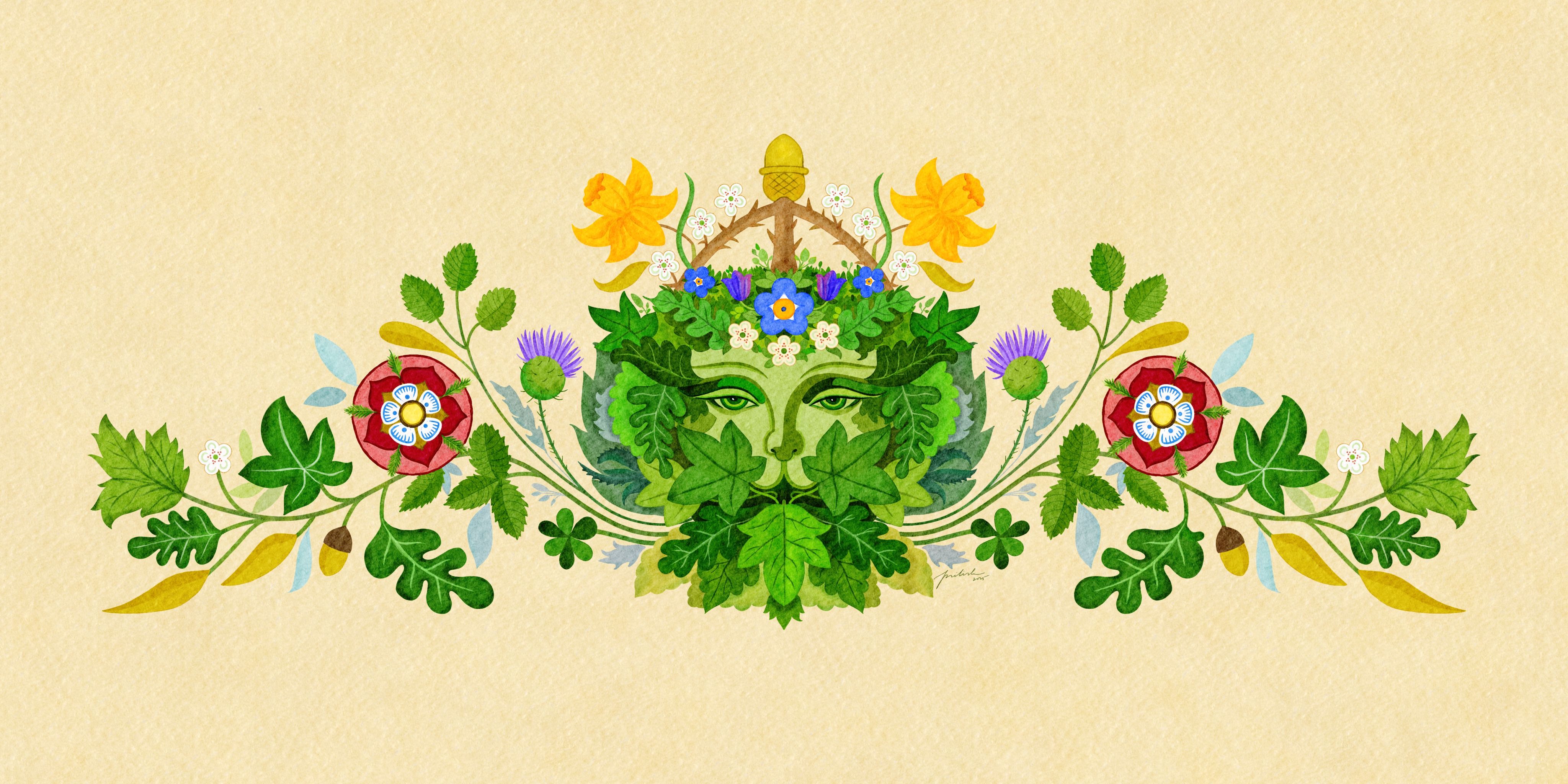 Based on heraldic artist Andrew Jamieson’s original illustration, this is my take on the mythical ‘Green Man’, a staple figure in Celtic art since the Iron Age. Appearing as a decorative and occasionally religious motif, the humanoid face is generally formed of oak, ivy, and hawthorn foliage and crowned in primrose and narcissus. This version also incorporates the United Kingdom’s four national flowers: Tudor rose, thistle, daffodil, and shamrock.