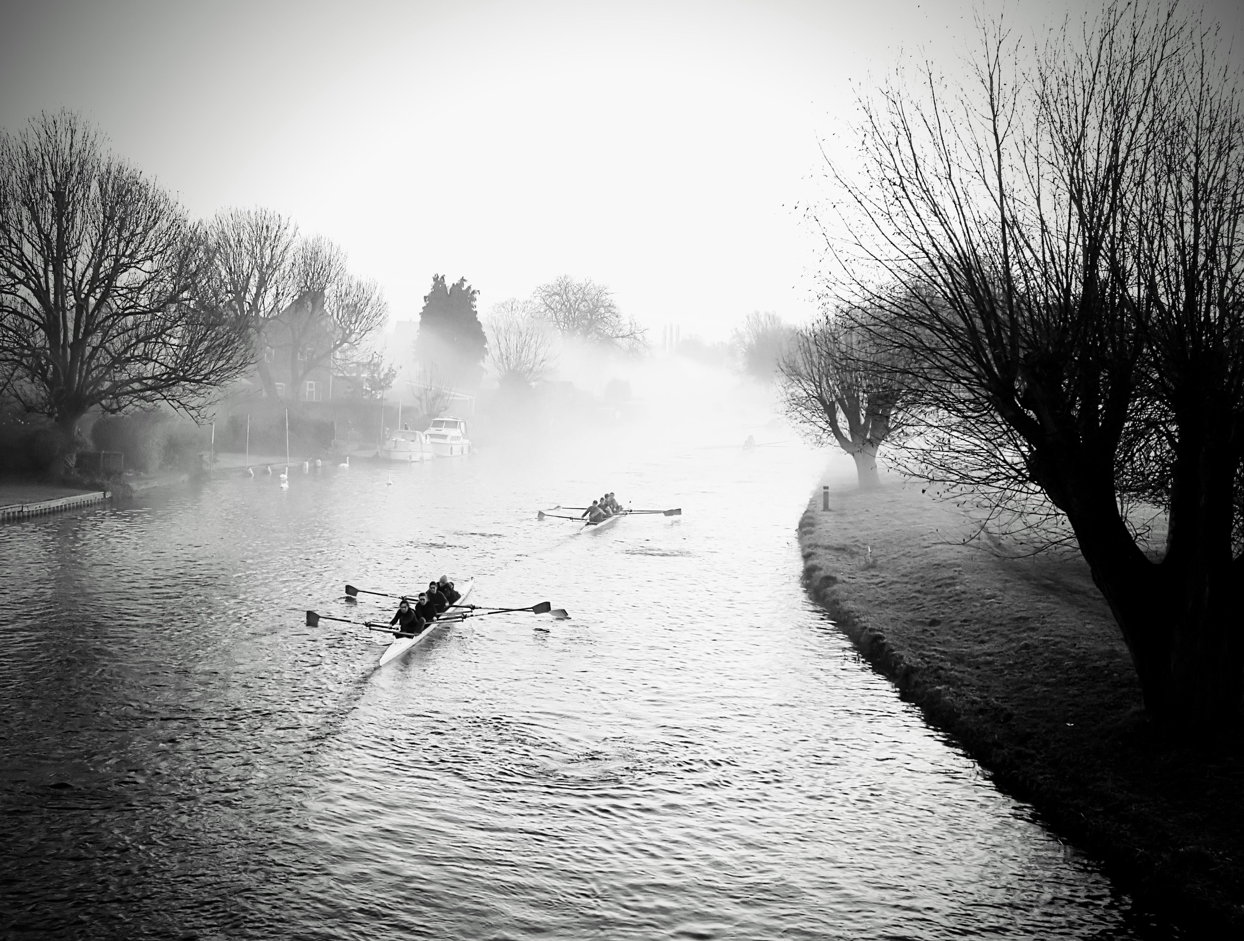 The image captures the ephemeral moment of three rowing teams being obscured to differing degrees by the fog of a Lent term early morning.