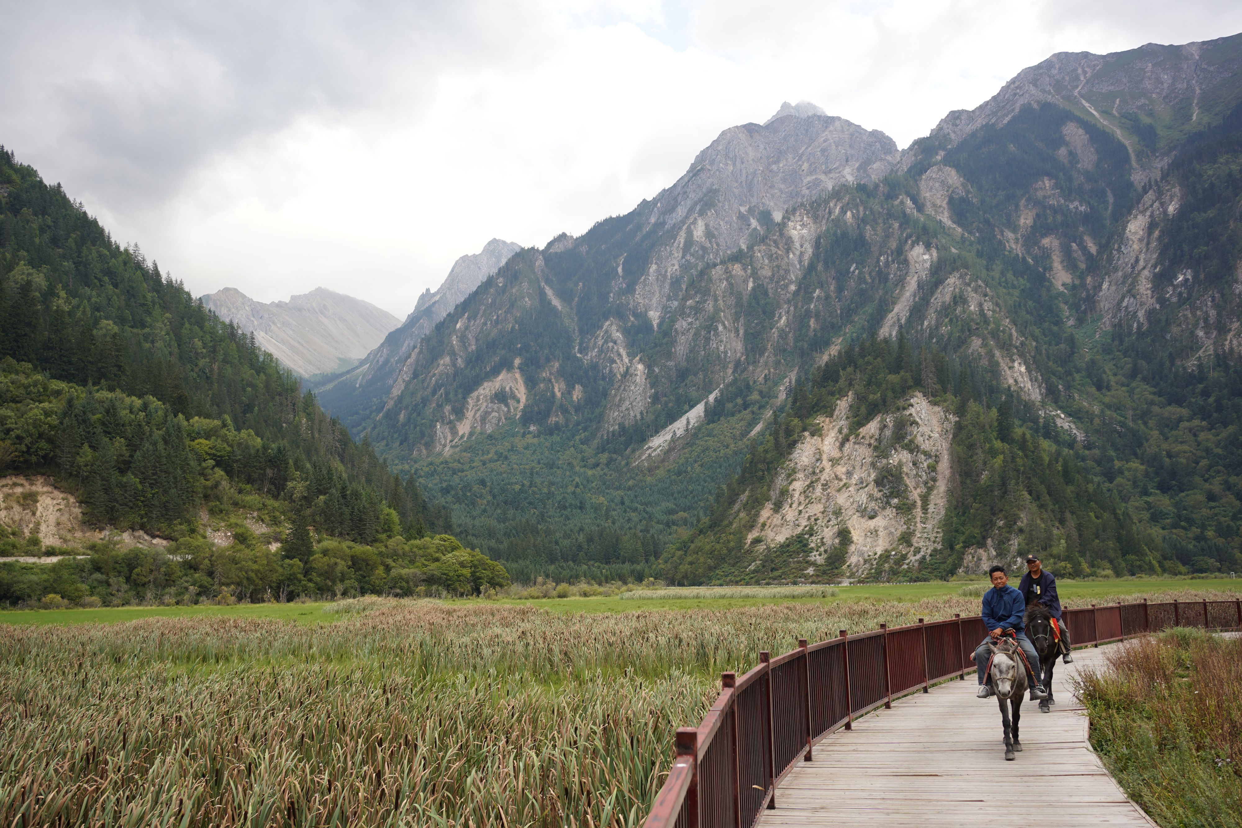 This photograph was taken in September 2024 in Songpan County, Ngawa Tibetan and Qiang Autonomous Prefecture, China, renowned for its stunning landscapes. The predominantly Tibetan locals rely mostly on agriculture and livestock raising; job opportunities for Tibetans are limited after finishing school, especially as many of them do not speak Mandarin. The men depicted pressure tourists into paying for a ride on the back of their horses for photos.