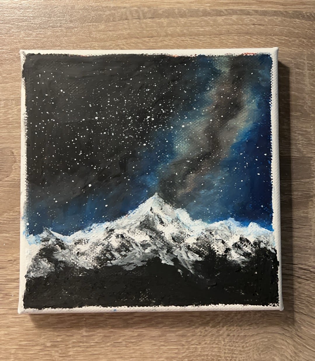 This artwork captures the serene beauty of nature's most mesmerizing phenomenon, inviting viewers to lose themselves in the harmony of earth and sky, where silence speaks and light tells stories untold. In the stillness of a snow-covered wilderness, the majestic peaks of the mountain range reach for the heavens, their icy crowns shimmering under the soft glow of moonlight. Above, the aurora dances in a symphony of colour—vivid greens, ethereal purples, and streaks of electric blue intertwine, painting the sky with cosmic wonder.